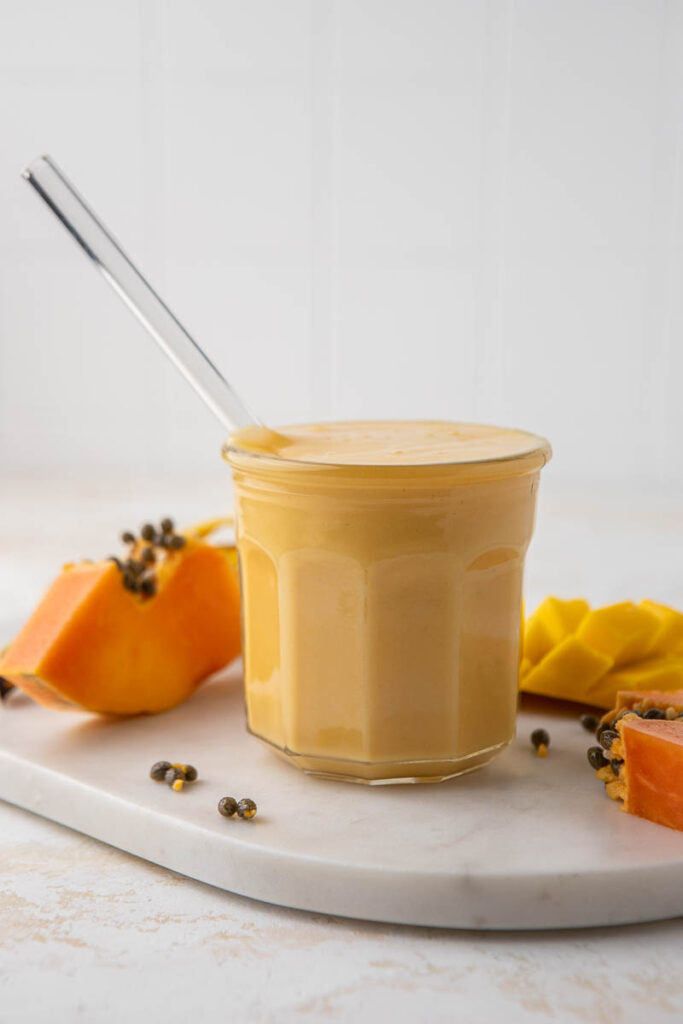 Mango Pawpaw Smoothie: Place 1c coconut milk, 3/4c small slices pawpaw, 3/4c mango, sliced into small pieces, ½ banana, cut into pieces and 1/2c Greek yoghurt into blender, in that order. Add a pinch of ginger powder, if so inclined. Blend until smooth.